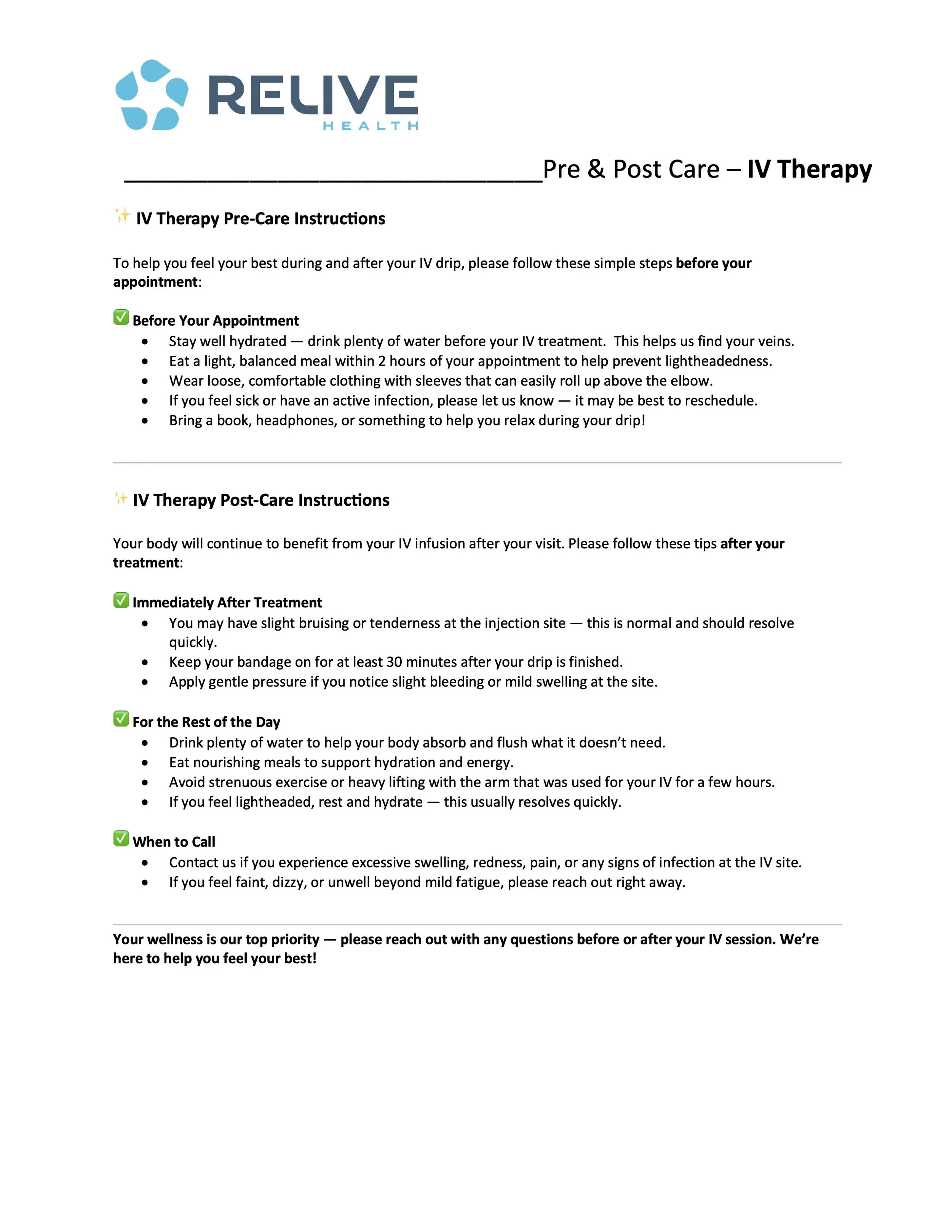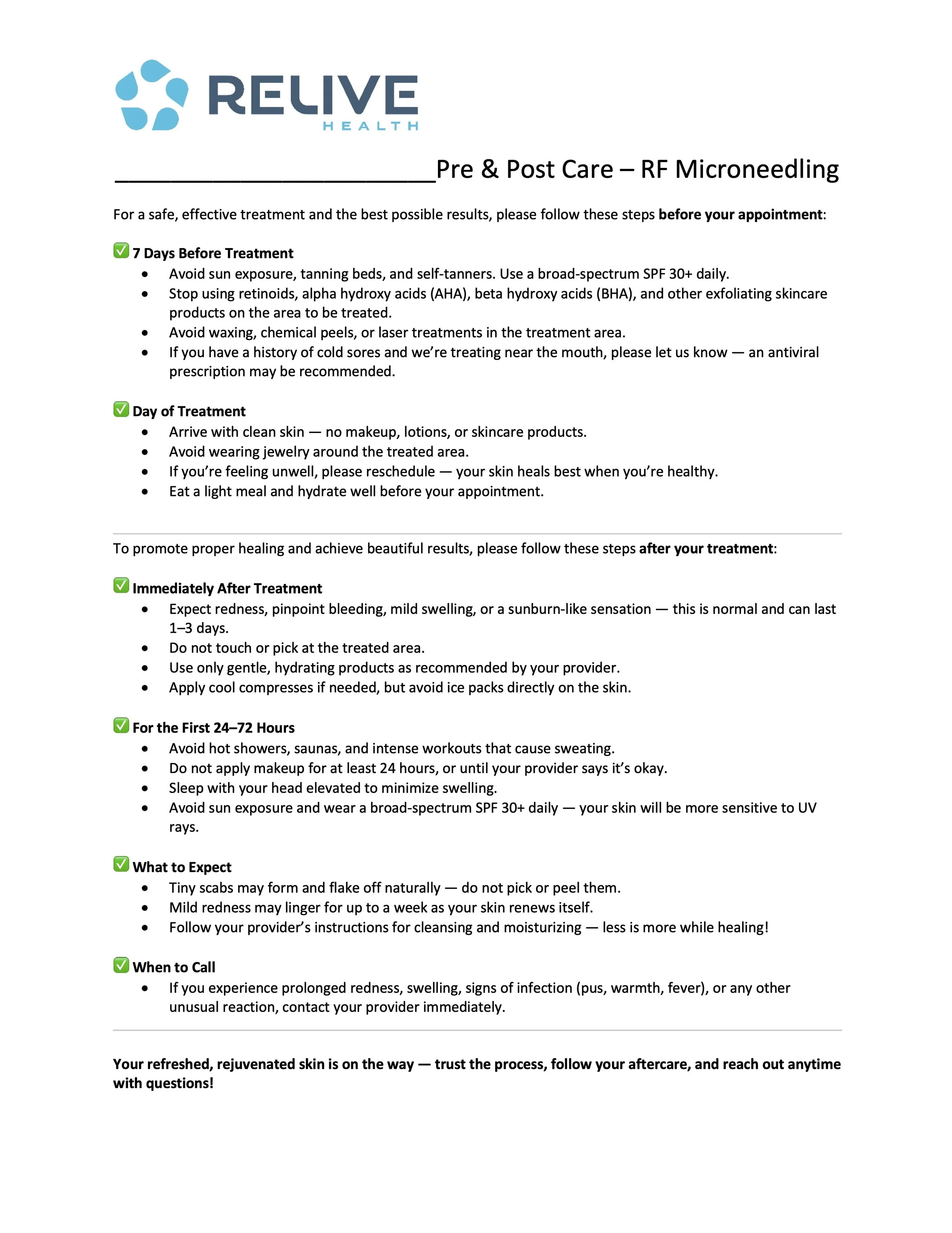 At Relive Health, your safety, comfort, and results are our top priorities. Every procedure — from neurotoxin and dermal fillers to laser treatments, microneedling, IV therapy, and blood draws — comes with clear pre- and post-care instructions to help you prepare, heal properly, and get the most out of your treatment.